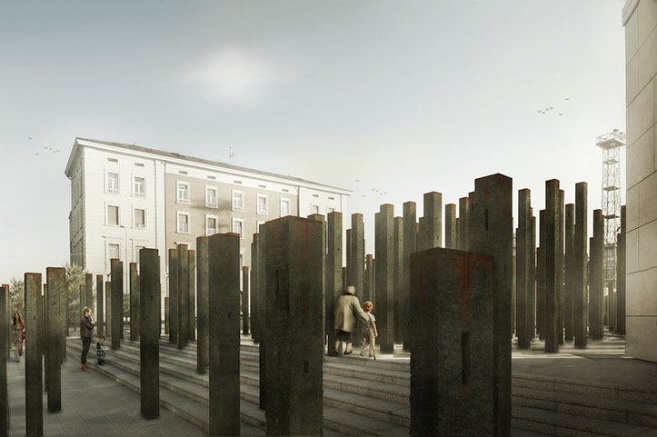 The conception of a remembrance site for an event with the significance and scope of the Shoah is bound to be an unconventional task. The sheer scale, ruthlessness and irrationality of this murderous episode make it difficult to convey its disturbing, horrific meaning. A classical single monument would be too limited and at the same time too close to a ‘commemorative’ typology, something that is not adequate given the nature of the event. A strong experience charged with symbolism appears to be a more appropriate way to remember the essence of this memory and help the newer generations to know and reflect on this dark page in History.The proposal intends to be a contrasting element in the city landscape, taking advantage of the site features in order to draw attention to itself and to what it represents.Dispersed columns grab the whole site, generating a bold visual impact that aims to trigger the curiosity of passers-by and, once inside, transport them into a different reality. The dispersion of the elements follows a principle of increasing density that relates symbolically with the escalation of anti-Semitic events that culminated in the Holocaust. A sense of disorientation takes hold of those who wander in between - no straight path is set. The uneasy atmosphere of this intertwined space becomes ever more distressful as one approaches the space behind the two existing walls that divide the square.In the middle of the backspace, where the columns reach a climactic density, a void emerges – a clearing in this imposing forest. It symbolizes the resistance of the victims that survived the tragedy and ultimately the defeat of the intentions of a criminal ideology. It is therefore intended to be an introspective and calm moment in the complex, the setting in which Hope and Peace can return. Only the sky will be visible beside the curtain of columns. An olive tree rises - a strong symbol in itself - showing that Life thrives, despite the harsh conditions.The columns have variable heights; yet they take part in a single huge three-dimensional composition. These pre-fabricated posts need not have a special structural resistance because they serve no load-bearing purposes, thus saving on weight and material. The exposure to the atmospheric conditions may give different identities to the elements, seeping a reddish tone on their surface. This way the monument’s nature will evolve throughout the years towards an ever more expressive look. It also aims to transcend the visual senses and the daytime setting. Different holes in the columns intend to take advantage of the passing winds to produce whistling sounds that emphasize the uniqueness of the space. During the night each column may subtly illuminate the space, granting it a solemn and unique aura.