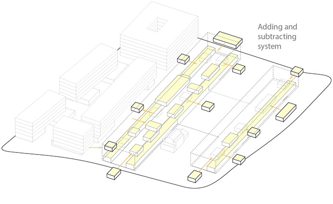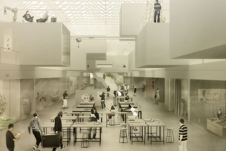 A proposta estabelece uma relação de forma e escala com a cidade envolvente. A posição e o esquema planimétrico da Nova Escola de Arquitectura relaciona-se directamente com o Godsbanen, e permite-lhe actuar como uma barreira acústica para os quarteirões residenciais no noroeste, onde os rés-do-chão são ocupados com lojas e serviços. As ciclovias e passeios pedonais misturam-se com o trânsito rodoviário condicionado, os terrenos verdes com os passeios, com árvores e mobiliário urbano disseminados pela área. O edifício da Escola tem um esquema funcional simples: duas ‘caixas’ longas e paralelas estendem-se ao longo do mais importante eixo da zona, ligadas por um espaço central comum que unifica o complexo. Isto cria dois espaços exteriores principais: a praça aumentada em frente ao Godsbanen, entrada urbana da escola; e o pátio sul, abrindo para a ‘faixa verde’ vizinha e albergando o edifício ferroviário preservado, agora habitação e estúdio.O espaço central comum é um grande átrio multifuncional que funciona como recepção e ponto de encontro da Escola, alojando ainda outros usos públicos, como a cozinha cívica, espaço de exposições e loja. As duas ‘alas’ longas contêm a maior parte da área lectiva. A ala noroeste, maior, inclui a maior parte das zonas de estudo e trabalho dos programas PhD e BA/MA, bem como salas de projecto e de reunião, e de interface para estágios, parceiros e relações internacionais. Funções mais específicas como gabinetes académicos ou admnistrativos, alojamento, ou a biblioteca, podem surgir num segundo e terceiro piso. No piso -1 existe também uma área técnica e de estacionamento. A ala sudeste conterá os restantes estúdios BA/MA e um auditório, bem como os laboratórios e oficinas de utilização mais ‘pesada’, e respectivos espaços de apoio.É nestas naves quase ‘industriais’ (de amplo tecto translúcido) que assenta o conceito espacial essencial, com enfâse na flexibilidade e escalabilidade. A partir do chão, um espaço contínuo de pé-direito alto alberga as actividades laborais e lectivas, usando mobiliário variado e/ou compartimentação flexível. É flanqueado por salas de menor pé-direito que podem ser divididas e abertas ou encerradas livremente, permitindo espaços comunitários ou alternativas mais privadas. Sobre estes flancos situam-se um ou dois mezzaninos, onde podem ser colocadas múltiplas ‘caixas’ de tamanho variável – aumentando (ou reduzindo) a área disponível consoante as necessidades da faculdade. Algumas destas cabinas poderão até ser pensadas e/ou construídas pelos próprios alunos. Os pontos fixos dos acessos verticais, bem como alguns sanitários e armazéns, proporcionam a estrutura em volta da qual as outras funções se conciliam.Prevê-se uma materialidade directa para o edifício. No exterior, uma fachada dupla semi-transparente providencia um meio de controlar as aberturas e transmite uma textura visual marcante e coerente a todo o conjunto. No interior, estrutura e infraestrutura são claras e fazem parte da expressão do edifício, com a abrangente cobertura trelissada e a iluminação e AVAC aparentes. A maior parte das soluções de compartimentação são flexíveis, com painéis ou janelas deslizantes, e no piso principal deverá ser usado um pavimento durável de cariz industrial. Um esquema de cores claro e uniforme garantirá uma atmosfera coerente e bem iluminada ao longo de todo o edifício. Esta abordagem pragmática ao acabamento permite uma maior disciplina no que toca aos custos de construção. Caso a escola necessite de áreas adicionais, um maior controlo orçamental pode ser atingido pelo uso do conceito das ‘caixas de ampliação’, evitando a exigência de construir novos edifícios.O edifício tira partido da faixa verde adjacente, encaminhando as águas da chuva para aquela zona ajardinada através de uma conduta subterrânea seguindo ao longo da via férrea desactivada (agora um percurso pedonal). Nesta frente sul, solarenga e agradável, própria para actividades ao ar livre, o exterior da escola estende a superfície natural, com áreas de jardim entre as construções e uma vasta paisagem verde enquadrando os volumes edificados, juntamente com uma cobertura vegetal.