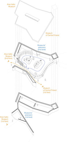 A nova construção posiciona-se entre o Museu Alvar Aalto e o Museu da Finlândia Central, ambos obras do mestre finlandês, pelo que o desafio define-se em como criar um espaço distintamente contemporâneo que ao mesmo tempo não tenta colocar-se demasiado em evidência face aos seus prestigiados vizinhos.A proposta tenta tirar partido do seu posicionamento recuado de forma a integrar-se mais suavemente na paisagem natural e edificada. Numa abordagem tendencialmente organicista, a sua geometria é um produto directo da disposição do seu interior. As direcções das paredes estão relacionadas com as plantas de ambos os museus; o tecto ajusta-se e complementa os tectos existentes; as passagens fazem uso de aberturas já existentes nas fachadas dos museus. A planta da extensão apresenta-se assim como um “ramo” orgânico do novo complexo museológico.A qualidade do espaço interior é o foco central do projecto. Elementos exteriores, como as janelas centrais e o lanternim, concorrem para gerar uma suave iluminação natural, com as janelas enquadrando a paisagem exterior. O espaço flui facilmente em volta dos balcões e montras da loja. Este arranjo da planta permite uma circulação livre bem como espaço de exposição em abundância para obras e produtos. O ambiente é ainda aprimorado pelos materiais utilizados. Os planos brancos das paredes rebocadas e dos tectos inclinados tendem para uma expressão acetinada, enquanto a madeira das estantes e balcões transmite uma discreta sensação de aconchego. Dois pilares em madeira exótica introduzem um toque de luxo que não é alheio ao conhecimento e gosto de Aalto por materiais de alta qualidade.
