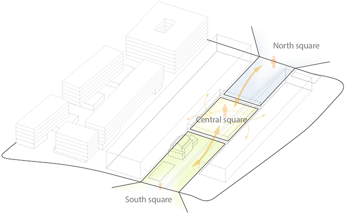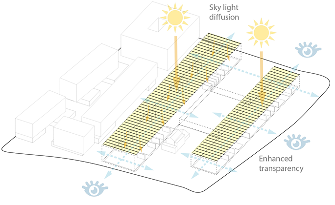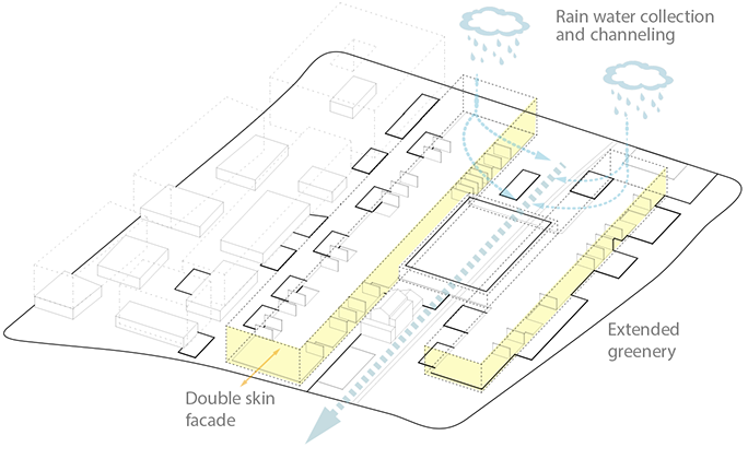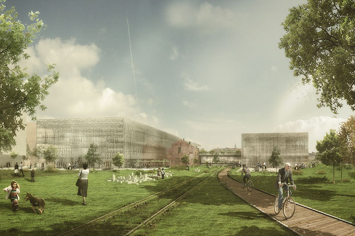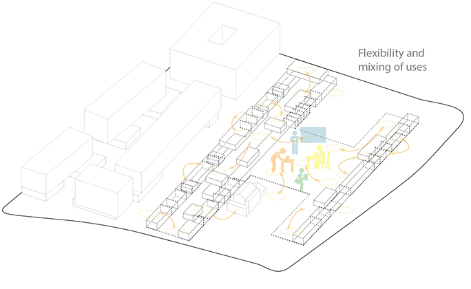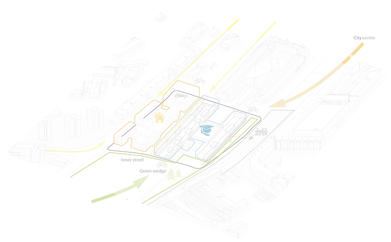 The proposal establishes a relation of form and scale with the surrounding city. The position and plan scheme of the New School of Architecture relates directly with Godsbanen, and lets it act as a noise barrier for the residential blocks on the northwest. To animate the urban ambience in this area the groundfloors are occupied with shops and services, with the school’s activities also extending outdoors. Bike and pedestrian pathways are mixed with low duty car lanes, green ground and pavements, and trees and urban furniture. The school building is arranged on a simple functional scheme: two long, parallel ‘boxes’ stretch along the main axis of the area, connected by a central common space that unifies the complex. This effectively creates two main exterior spaces: the extended square in front of Godsbanen which is the school’s urban entrance; and the southern ‘court’ opening to the ‘green wedge’ and harbouring the preserved railway building, now a house and studio.The central common space is a large multifunctional hall that acts as the school’s reception and gathering venue, while housing most of the most public uses, such as the civic kitchen, exhibition space or the book/materials shop. The two long wings contain most of the school’s area. The larger northwestern wing is able to accomodate most of the study and workspaces for PhD and BA/MA programmes, project and meeting rooms, as well as interface offices for internships, partners and international relations. More specific functions such as academic or administrative offices, accommodation quarters, or the library, can placed on second and third floors. Underground there is also a small garage and technical area. The southeastern wing may hold the remainder of BA/MA studios and a dedicated conference room, as well as heavier duty labs and workshops, with an array of support spaces.It’s also on these two main factory-like wings (bearing a wide translucent roof) that lies the central spatial concept, emphasizing flexibility and scalability. On the ground a high-ceilinged continuous space holds the main studying and working activities, using various furniture and/or versatile space-dividing devices. It is flanked by additional lower-ceiling compartments which can also be divided freely and be opened or closed at will, allowing for community-focused contacting spaces, or more secluded alternatives. On top of these flanks sit one or two mezzanines, where multiple ‘boxes’ of variable sizes can be placed - extending (or reducing) the available area according to the needs of the school. Some of these ‘booths’ could even be devised and/or built by the students. The fixed vertical shafts for stairs and lifts, along with some storage and WCs, provide the framework around which the other functions can be arranged.A direct materiality is envisioned for the building. In the exterior a two-layered transparent façade provides a means for controlling openings and conveys an interesting and coherent visual texture to the whole set. In the interior structure and infrastructure are clear and part of the building’s expression, with its all-encompassing trussed roof and undisguised lighting and HVAC. Most space dividers are flexible and transparent solutions such as sliding panels or windows, and a durable industrial-grade should be used on the main floor. An uniform bright colouring of most of the elements ensures a coherent and pleasant well-lit atmosphere across the building. This pragmatic approach to building enables more discipline regarding construction costs. Should the school need add-ons to increase area, greater cost-control can also be achieved through the use of the ‘extension boxes’ concept, avoiding the need for construction of additional buildings.The building takes advantage of the adjacent green wedge, leading the rainwater towards it, through an underground duct following the railway tracks (now a pedestrian pathway). On this sunny and pleasant southern front, more inviting for outdoor activities, the exterior of the school extends the natural surface, with garden areas between the constructions and a wide green landscape framing the building volumes, along with a green central roof.