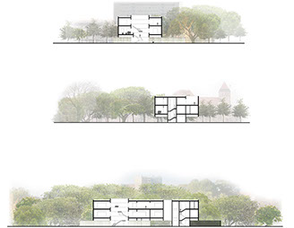 The proposal aims to take advantage of this location, making the museum the main gateway between the City Centre and the City Park, through a passage at ground level, between the main public spaces and service parts of the building. A clear volume is positioned on top of the planes that define this ground floor. Two big ‘shafts’ exist in this mass: one provides a covered skylight to the foyer and the other illuminates the way to the Park. The boxy volume is where the exhibition spaces and main supporting and administration services are located.
