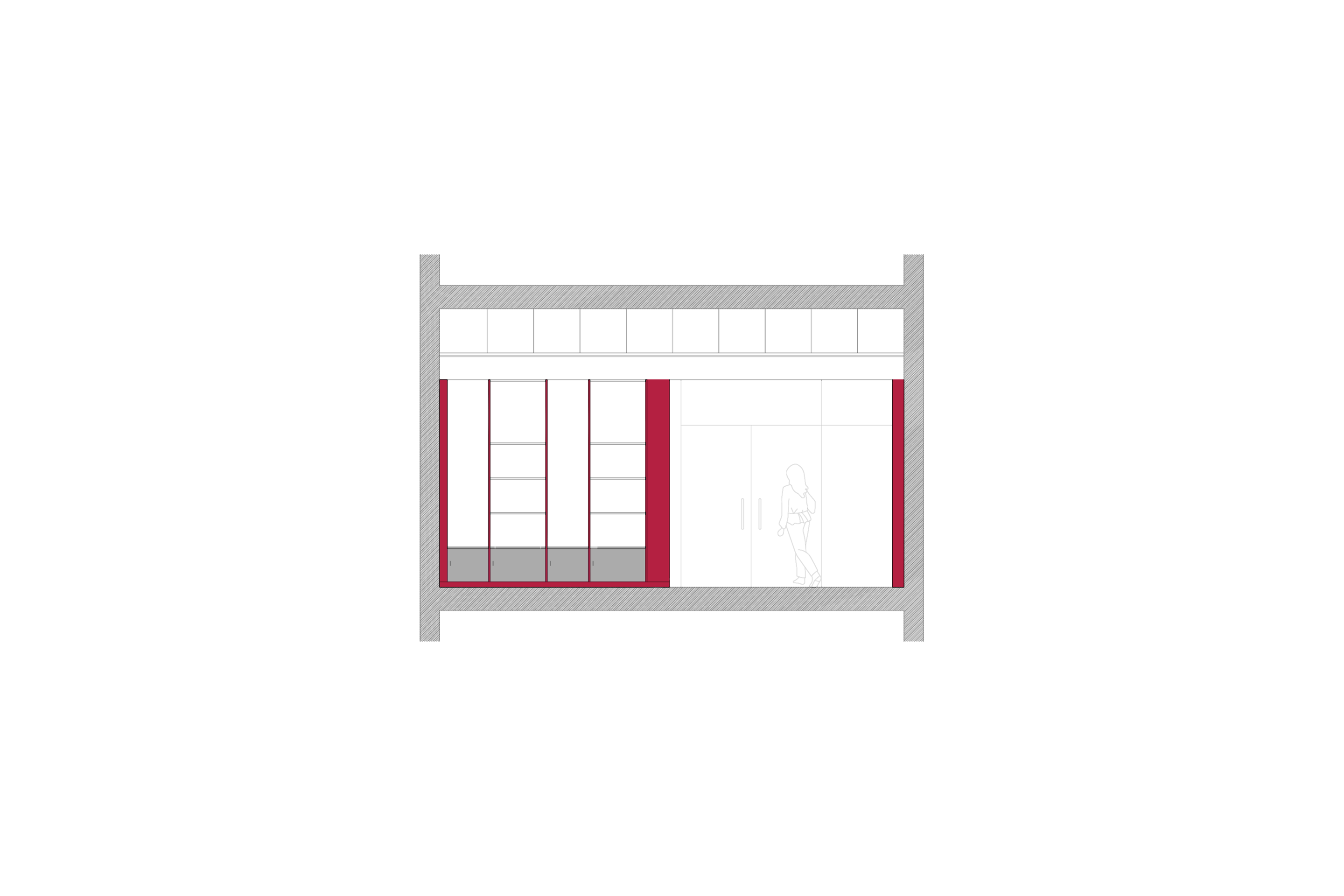 Given the low-cost nature of the whole undertaking, a part of the existing furniture was re-used, although with a new positioning. Building on the theme of the shop’s name and the corresponding logo, a vivid colour was chosen for the painting of the columns – thus assuming their character, protruding from the wall – and of the new furniture, assembling a new colour scheme that would become a trademark of this new commercial space.