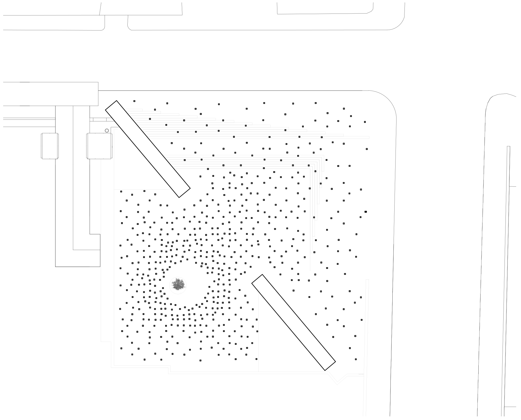 In the middle of the backspace, where the columns reach a climactic density, a void emerges – a clearing in this imposing forest. It symbolizes the resistance of the victims that survived the tragedy and ultimately the defeat of the intentions of a criminal ideology. It is therefore intended to be an introspective and calm moment in the complex, the setting in which Hope and Peace can return. Only the sky will be visible beside the curtain of columns. An olive tree rises - a strong symbol in itself - showing that Life thrives, despite the harsh conditions.