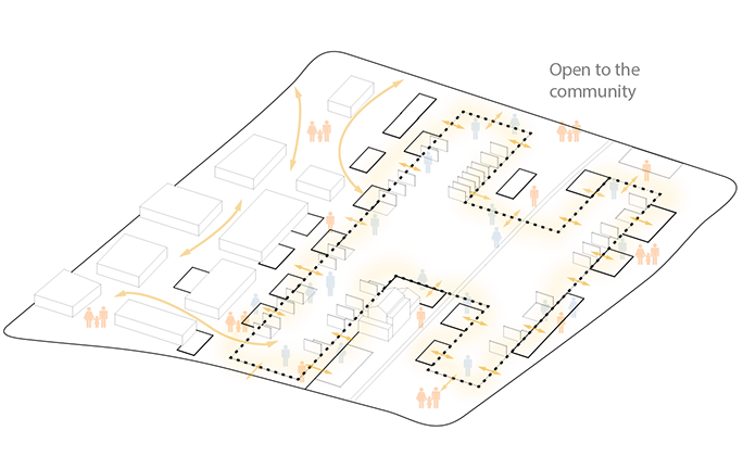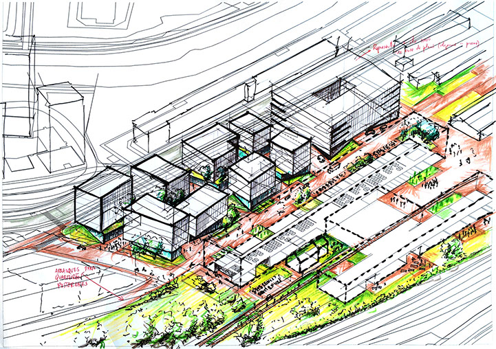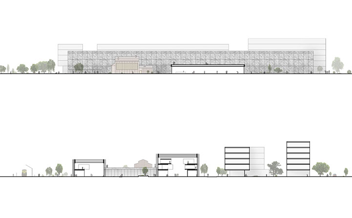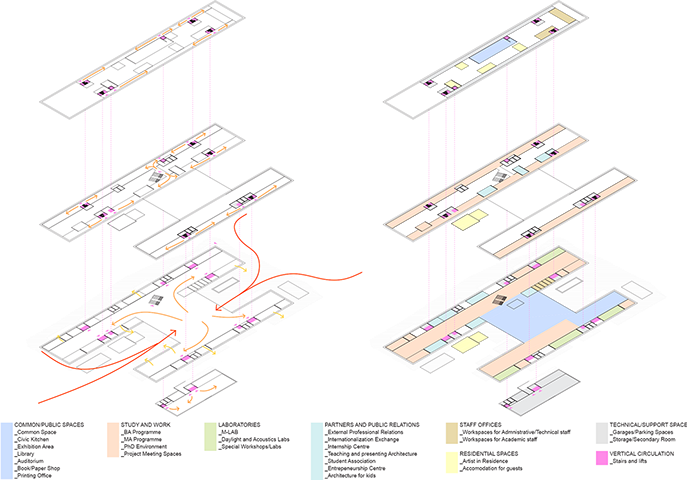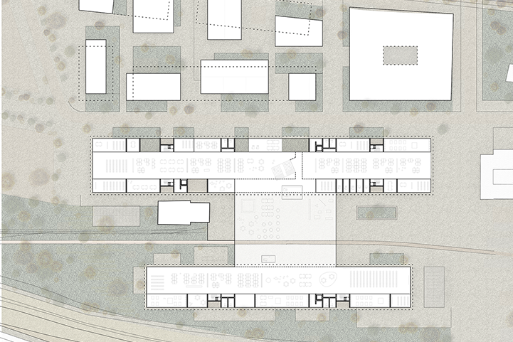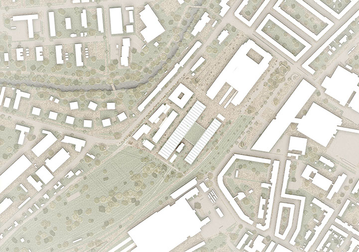 A proposta estabelece uma relação de forma e escala com a cidade envolvente. A posição e o esquema planimétrico da Nova Escola de Arquitectura relaciona-se directamente com o Godsbanen, e permite-lhe actuar como uma barreira acústica para os quarteirões residenciais no noroeste, onde os rés-do-chão são ocupados com lojas e serviços. As ciclovias e passeios pedonais misturam-se com o trânsito rodoviário condicionado, os terrenos verdes com os passeios, com árvores e mobiliário urbano disseminados pela área. O edifício da Escola tem um esquema funcional simples: duas ‘caixas’ longas e paralelas estendem-se ao longo do mais importante eixo da zona, ligadas por um espaço central comum que unifica o complexo. Isto cria dois espaços exteriores principais: a praça aumentada em frente ao Godsbanen, entrada urbana da escola; e o pátio sul, abrindo para a ‘faixa verde’ vizinha e albergando o edifício ferroviário preservado, agora habitação e estúdio.O espaço central comum é um grande átrio multifuncional que funciona como recepção e ponto de encontro da Escola, alojando ainda outros usos públicos, como a cozinha cívica, espaço de exposições e loja. As duas ‘alas’ longas contêm a maior parte da área lectiva. A ala noroeste, maior, inclui a maior parte das zonas de estudo e trabalho dos programas PhD e BA/MA, bem como salas de projecto e de reunião, e de interface para estágios, parceiros e relações internacionais. Funções mais específicas como gabinetes académicos ou admnistrativos, alojamento, ou a biblioteca, podem surgir num segundo e terceiro piso. No piso -1 existe também uma área técnica e de estacionamento. A ala sudeste conterá os restantes estúdios BA/MA e um auditório, bem como os laboratórios e oficinas de utilização mais ‘pesada’, e respectivos espaços de apoio.É nestas naves quase ‘industriais’ (de amplo tecto translúcido) que assenta o conceito espacial essencial, com enfâse na flexibilidade e escalabilidade. A partir do chão, um espaço contínuo de pé-direito alto alberga as actividades laborais e lectivas, usando mobiliário variado e/ou compartimentação flexível. É flanqueado por salas de menor pé-direito que podem ser divididas e abertas ou encerradas livremente, permitindo espaços comunitários ou alternativas mais privadas. Sobre estes flancos situam-se um ou dois mezzaninos, onde podem ser colocadas múltiplas ‘caixas’ de tamanho variável – aumentando (ou reduzindo) a área disponível consoante as necessidades da faculdade. Algumas destas cabinas poderão até ser pensadas e/ou construídas pelos próprios alunos. Os pontos fixos dos acessos verticais, bem como alguns sanitários e armazéns, proporcionam a estrutura em volta da qual as outras funções se conciliam.Prevê-se uma materialidade directa para o edifício. No exterior, uma fachada dupla semi-transparente providencia um meio de controlar as aberturas e transmite uma textura visual marcante e coerente a todo o conjunto. No interior, estrutura e infraestrutura são claras e fazem parte da expressão do edifício, com a abrangente cobertura trelissada e a iluminação e AVAC aparentes. A maior parte das soluções de compartimentação são flexíveis, com painéis ou janelas deslizantes, e no piso principal deverá ser usado um pavimento durável de cariz industrial. Um esquema de cores claro e uniforme garantirá uma atmosfera coerente e bem iluminada ao longo de todo o edifício. Esta abordagem pragmática ao acabamento permite uma maior disciplina no que toca aos custos de construção. Caso a escola necessite de áreas adicionais, um maior controlo orçamental pode ser atingido pelo uso do conceito das ‘caixas de ampliação’, evitando a exigência de construir novos edifícios.O edifício tira partido da faixa verde adjacente, encaminhando as águas da chuva para aquela zona ajardinada através de uma conduta subterrânea seguindo ao longo da via férrea desactivada (agora um percurso pedonal). Nesta frente sul, solarenga e agradável, própria para actividades ao ar livre, o exterior da escola estende a superfície natural, com áreas de jardim entre as construções e uma vasta paisagem verde enquadrando os volumes edificados, juntamente com uma cobertura vegetal.