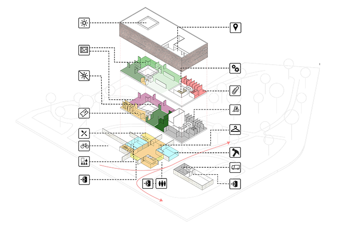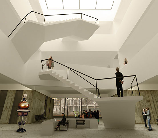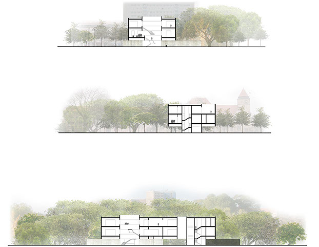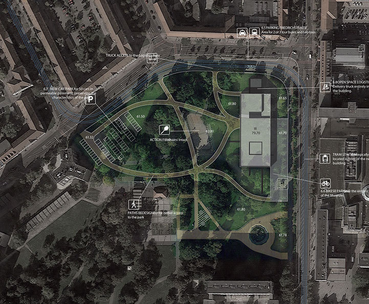 Um Museu da Bauhaus é naturalmente um projecto com um especial significado para a cidade de Dessau. O sítio escolhido para a sua implantação demonstra esta realidade claramente.A proposta procura tirar partido desta localização, transformando o museu no principal ponto de passagem entre o Centro e o Parque da Cidade, através de um atravessamento no nível térreo, situado entre os principais espaços “públicos” e as zonas de serviço do edifício. É posicionado um volume, uma caixa de linhas claras, no topo dos planos que definem este piso. Dois grandes “poços” existem nesta massa: um corresponde ao espaço central do foyer, coberto por um lanternim; o outro ilumina o caminho para o Parque. O volume paralelipipédico alberga os espaços de exposição e a maioria dos espaços técnicos de apoio e administração.A materialidade do edifício enfatiza este conceito claro. A “caixa” paralelipipédica é revestida em tijolo maciço, apoiada nos planos de betão aparente do piso térreo, que por sua vez se estendem igualmente pelo terreno envolvente, integrando o Parque na proposta.