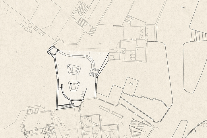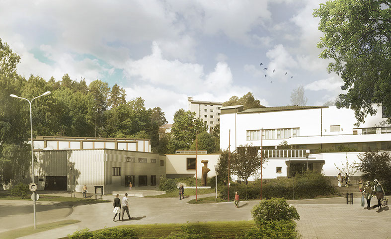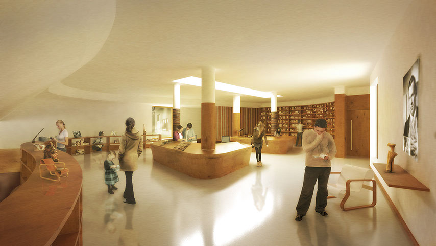 A nova construção posiciona-se entre o Museu Alvar Aalto e o Museu da Finlândia Central, ambos obras do mestre finlandês, pelo que o desafio define-se em como criar um espaço distintamente contemporâneo que ao mesmo tempo não tenta colocar-se demasiado em evidência face aos seus prestigiados vizinhos.A proposta tenta tirar partido do seu posicionamento recuado de forma a integrar-se mais suavemente na paisagem natural e edificada. Numa abordagem tendencialmente organicista, a sua geometria é um produto directo da disposição do seu interior. As direcções das paredes estão relacionadas com as plantas de ambos os museus; o tecto ajusta-se e complementa os tectos existentes; as passagens fazem uso de aberturas já existentes nas fachadas dos museus. A planta da extensão apresenta-se assim como um “ramo” orgânico do novo complexo museológico.A qualidade do espaço interior é o foco central do projecto. Elementos exteriores, como as janelas centrais e o lanternim, concorrem para gerar uma suave iluminação natural, com as janelas enquadrando a paisagem exterior. O espaço flui facilmente em volta dos balcões e montras da loja. Este arranjo da planta permite uma circulação livre bem como espaço de exposição em abundância para obras e produtos. O ambiente é ainda aprimorado pelos materiais utilizados. Os planos brancos das paredes rebocadas e dos tectos inclinados tendem para uma expressão acetinada, enquanto a madeira das estantes e balcões transmite uma discreta sensação de aconchego. Dois pilares em madeira exótica introduzem um toque de luxo que não é alheio ao conhecimento e gosto de Aalto por materiais de alta qualidade.